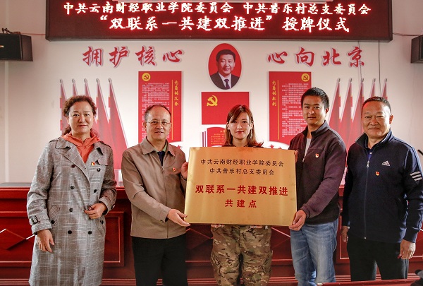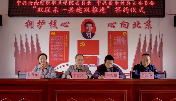 11号早上,扶贫走访工作队一行到达普乐村村委会。在村委会会议室,举行中共云南财经职业学院委员会与中共普乐村总支委员会“双联系一共建双推进”的签约仪式。学院党委书记李思泽同志代表学院与中共普乐村总支委员会书记杨雪彬签约。签约后,进行了“双联系一共建双推进”共建点授牌仪式。随后召开了学校扶贫走访工作队和普乐村党总支成员的座谈会。在座谈会上,同志们围绕党建带扶贫,扶贫促党建进行了交流发言。李思泽书记强调,要认真学习领会和落实习近平总书记在重庆主持召开解决“两不愁三保障”突出问题座谈会上的重要讲话精神,以习近平总书记给云南省贡山县独龙江乡群众的回信为指引,学校党委与普乐村党总支紧密协作,团结带领普乐村群众,全力以赴打好脱贫攻坚仗,为实现普乐村整体脱贫共迎美好生活而不懈努力奋斗。