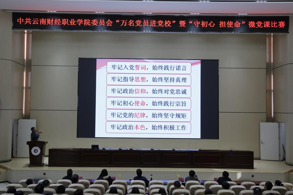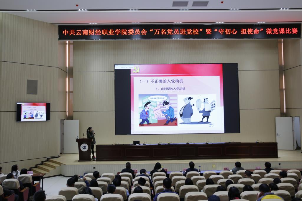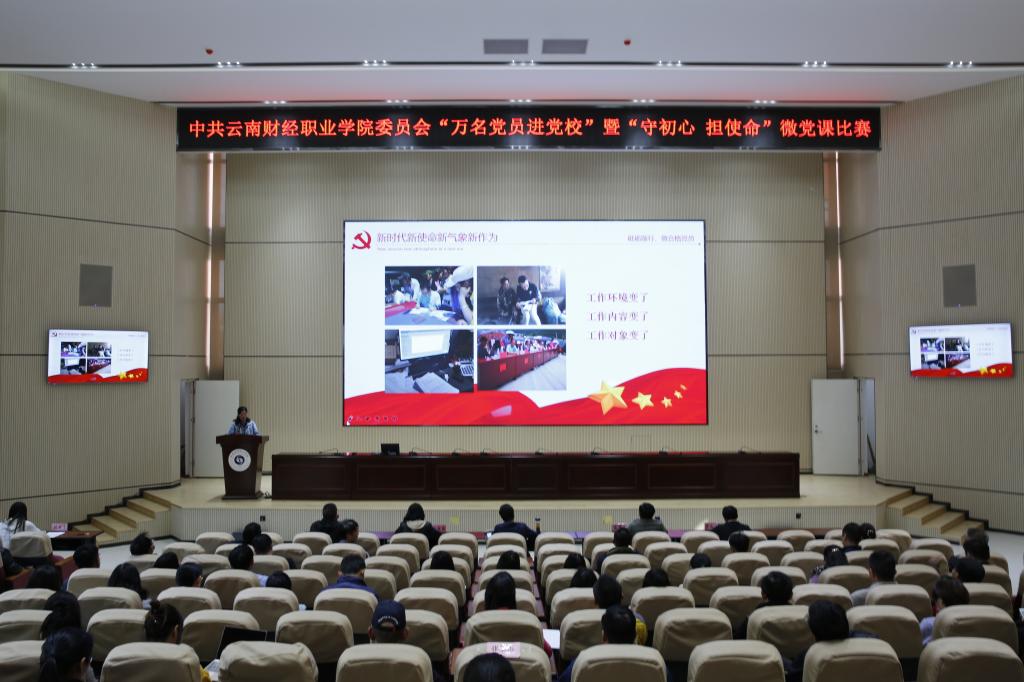 为持续深入学习贯彻习近平新时代中国特色社会主义思想和党的十九大、十九届二中、三中、四中、五中全会精神,按照省委教育工委相关工作要求,云南财经职业学院于11月13日在学校报告厅举办了微党课比赛。学校党委副书记仲新、纪委书记杨红英、组织部部长张国庆、宣传部统战部部长陈君奇及思想政治理论教学部主任李如良受邀担任评委,来自学校各个党支部的教师党员及部分学生党员培养对象共计90余人现场观看了比赛。