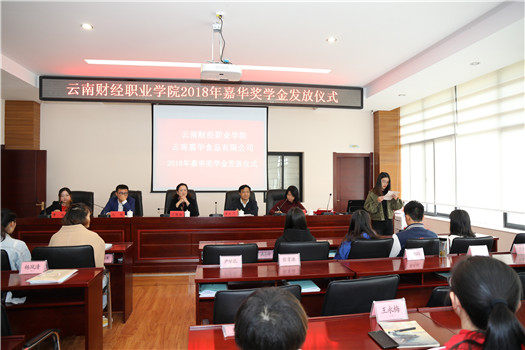 秋风送爽,丹桂飘香。2018年11月1日下午,2018年嘉华奖学金发放仪式在财苑楼三楼多媒体教室举行。我校副院长沈豫琼、工商管理系主任王兆远、云南嘉华食品有限公司组织规划部经理沈涛、云南嘉华食品饼屋公司行政人事经理万欢以及“嘉华店长班”和2017级市场营销班100多名学生参加了此次发放仪式。仪式由校企合作处副处长石彬主持。