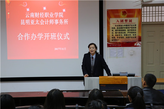 2017年11月9日,在学校训导楼二楼多媒体教室举行云南财经职业学院与昆明亚太会计师事务所合作办学开班仪式,学院沈豫琼副院长、昆明亚太会计师事务所闻山松所长、校企双方相关部门领导、老师和35名入选“亚太班”的大三学生参加了本次活动。