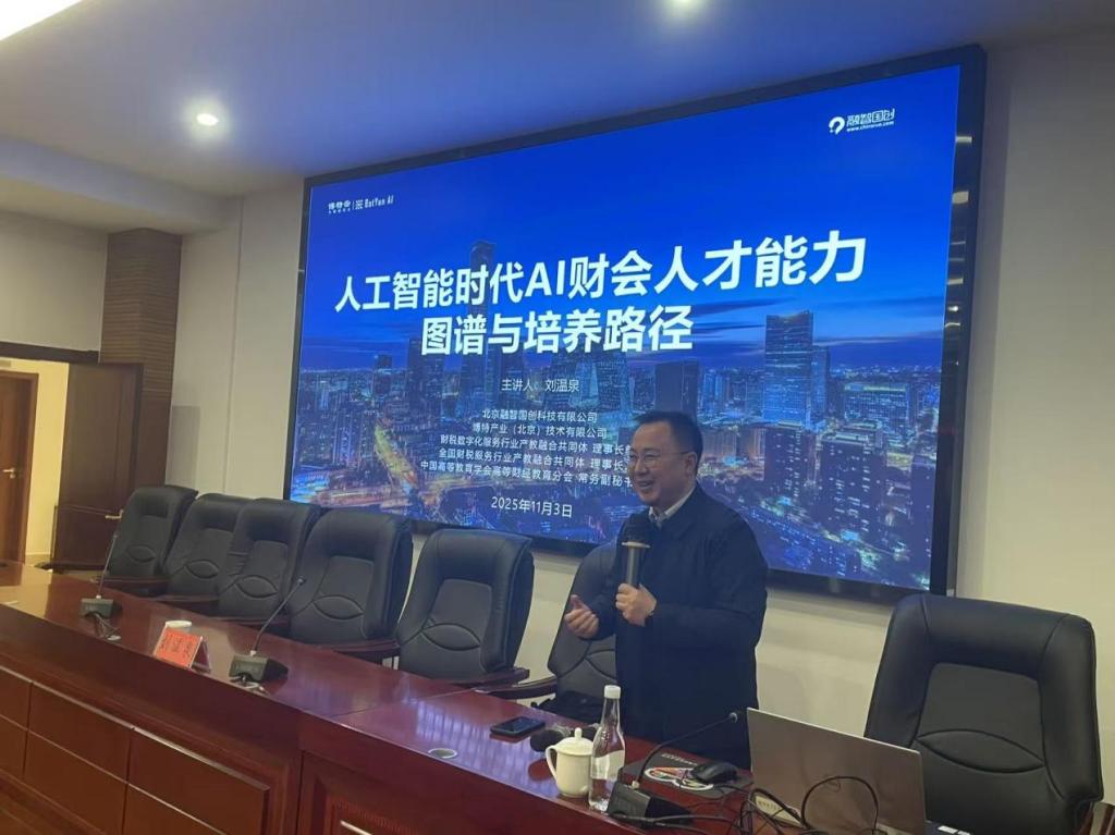 为深化产教融合,精准对接行业前沿人才需求,2025年11月3日晚19:30,我校智慧会计学院在财苑楼举办会计信息管理专业现代学徒制班专题讲座,2023级、2024级会计信息管理专业和2024级高本贯通班学生参加讲座。本次讲座特邀财税数字化领域资深专家、北京融智国创有限公司总裁刘温泉,以“人工智能时代AI财会人才能力图谱与培养路径”为主题进行分享。讲座由智慧会计学院院长王兆远主持。