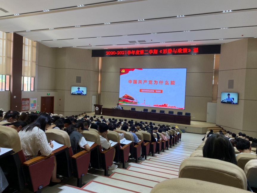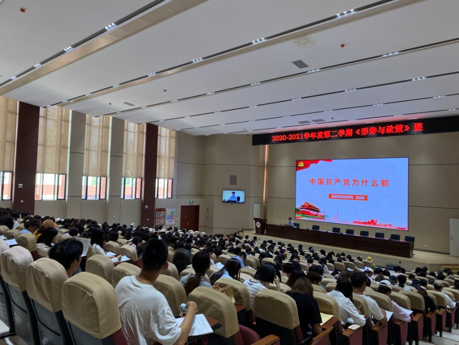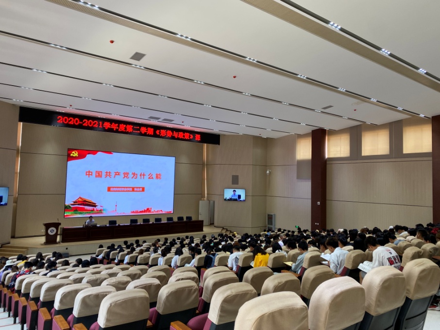 为进一步加强大学生党史、新中国史、改革开放史、社会主义发展史“四史”学习教育,充分发挥思想政治理论课主渠道作用。2021年5月6日下午,学校党委书记张金甫为我校2019级近400名学生作了题为“中国共产党为什么能”的形势与政策课专题报告。