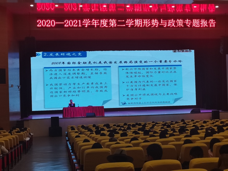 为让学生进一步认识构建以国内大循环为主体、国内国际双循环相互促进的新发展格局,是我们党和国家顺应发展规律,准确识变、科学应变、主动求变的重大战略型创新。2021年5月6日,思政部教师朵尔奎在大礼堂为我校2019级近700名学生做了题为“看懂新发展格局这盘大棋”的形势与政策专题讲座。