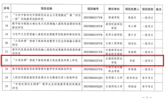 近日,中共云南省委宣传部发布《关于2025年云南省社科规划高校思想政治理论课研究专项的通知》我校马克思主义学院党支部书记李凌申报的《“大思政课”视域下高校党建与思政课协同育人研究》获批一般项目立项。