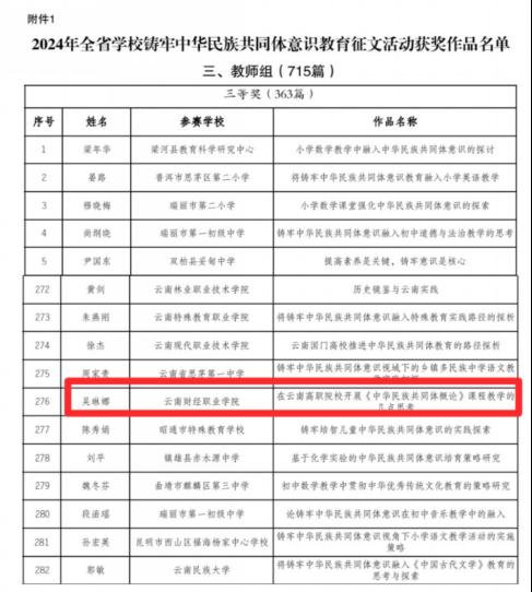 近日,云南省教育厅、云南省民族宗教事务委员会组织的2024年度云南省学校铸牢中华民族共同体意识教育征文活动结果揭晓,我校马克思主义学院教师吴琳娜文章《在云南高职院校开展<中华民族共同体概论>课程教学的几点思考》荣获教师组三等奖。
