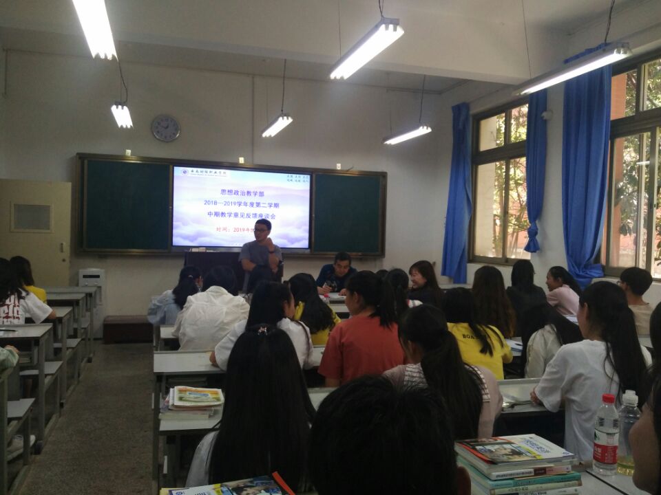 2019年5月7日中午12:40,思想政治教学部组织2018级和2017级财税金融系、工商管理系和信息工程系全体学习委员,在1号教学楼111教室召开本学期中期教学意见反馈暨征集意见座谈会。思政部主任及教研室主任参加了会议。