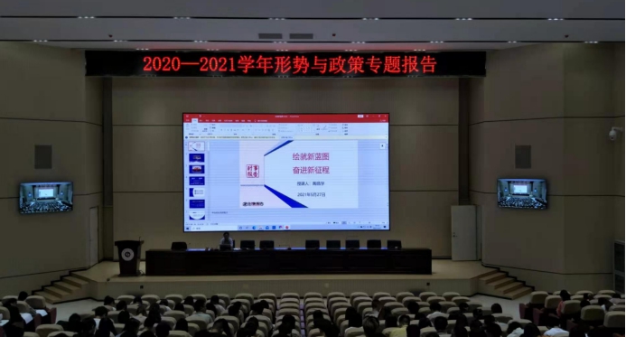 党的十九届五中全会锚定2035年远景目标,综合考虑未来一个时期国内外发展趋势和我国发展条件,对“十四五”时期我国发展作出系统谋划和战略部署。为了让学生充分认识以习近平同志为核心的党中央团结带领全党全国人民风雨兼程、奋力前行的坚强意志和非凡领导能力,全面认识党中央的战略意图和深远考量。2021年5月27日下午,学校校长陶昌学同志在报告厅为我校2019级近400名学生上了一堂题为“绘就新蓝图 奋进新征程”的形势与政策专题讲座。