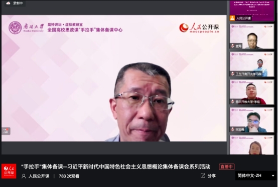 为充分发挥马克思主义理论学科建设校际联合的师资优势,强化思政课建设顶层设计与统筹协调,将讲好习近平新时代中国特色社会主义思想作为重大政治任务抓出实效,把思政课程改革创新成功的做法和经验融入培养时代新人的全过程。5月26日,由全国高校思政课“手拉手”集体备课中心(南开大学——湖南省)、南开大学马克思主义学院主办,大思政课建设协同创新中心、重庆开放大学承办的集体备课活动暨习近平新时代中国特色社会主义思想概论系列备课会启动仪式在线举行。马克思主义学院全体思政课教师到铭德楼302室参加培训。