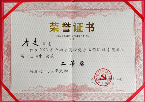 10月8日下午,2023年云南省高校党务工作队伍素质能力展示比赛活动决赛在云南农业大学举行,我校马克思主义学院党支部书记李凌同志以高职院校第一名的好成绩获得二等奖。