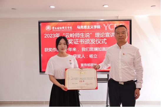 支部推选的选手在2023年“云岭师生说”比赛中获语言类学生组优秀奖,学校宣传部部长给获奖选手颁发了奖状。