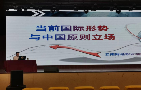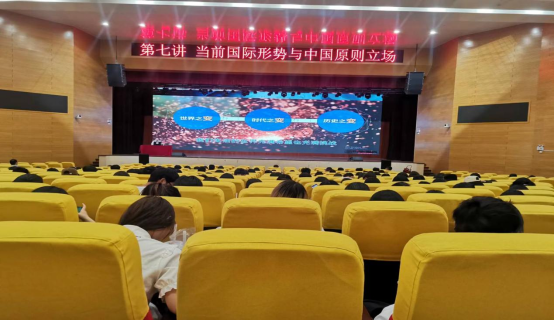 张金甫书记以当前世界正处于百年未有之大变局为切入点,结合当前国际形势,围绕“动荡变革的世界”“全球瞩目的热点”和“大国风范的外交”三个方面,深入浅出地讲清楚世界正进入新的动荡变革期、中国应对国际热点问题的原则立场、中国特色大国外交的战略部署三个问题,让学生深刻认识到世界大变局加速演进,世界进入新的动荡变革期。中国始终站在历史正确的一边、时代进步的一边,不断为世界注入宝贵的稳定性和正能量,把构建人类命运共同体的伟大事业推向新的高度,为维护世界和平、促进共同发展作出新的贡献。