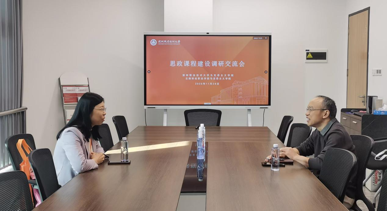 为深化新时代高校思想政治理论课改革创新,搭建校际马院交流合作桥梁,11月28日,云南财经职业学院马克思主义学院党支部书记李凌与深圳职业技术学院马克思主义学院党支部书记陈宝华围绕推进思政课高质量建设开展专题交流座谈。双方聚焦课程建设、师资培育、协同育人三大核心议题,分享特色经验、碰撞思想火花,为校际思政教育协同发展凝聚共识。