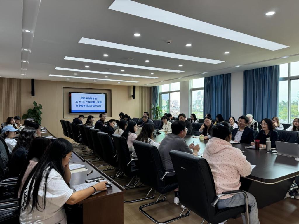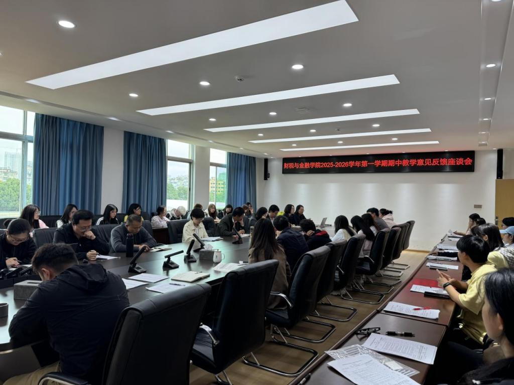 为落实学校提升教学质量的总体要求,保证学院教学工作平稳有序运行,教学管理进一步规范,2025年10月16日下午13:00,财税与金融学院2025-2026学年第一学期期中教学意见反馈会在大观校区汇贤楼四楼会议室召开,学院党支部书记罗勇、院长杨雯婷、教研室主任、专业带头人、教学秘书、专职辅导员、爱尔信数字经济产业学院教学负责人、学生管理负责人及26个班学生代表参加会议。