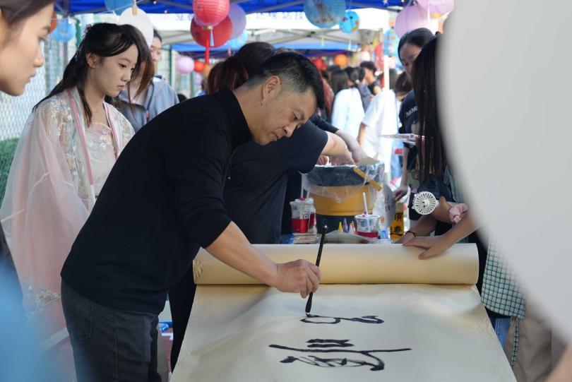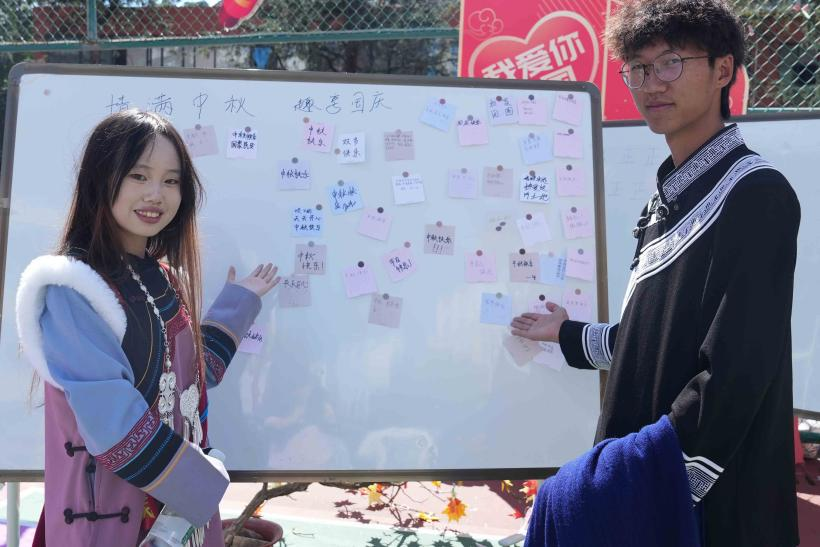 “我为祖国送祝福”活动专区,“祝福祖国”展板上贴满了五颜六色的卡片。师生们写下“愿祖国繁荣昌盛,各民族同心共筑中国梦”“祝祖国山河锦绣,56个民族永远像石榴籽一样紧紧相拥”的诚挚祝福。书法社现场写书签、漆扇题字,为大家送出满含墨香的祝福。