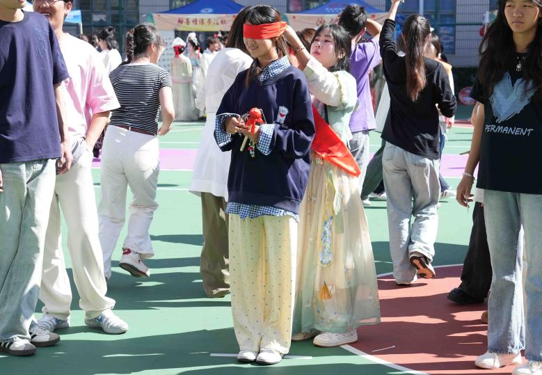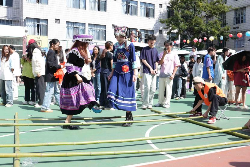 传统游戏打卡区有猜灯谜、丢沙包、夹月饼、投壶、套圈、蒙眼敲锣等经典民俗游戏。民族游戏互动环节的竹竿舞节奏轻快,师生默契配合,展现了一幅民族团结的温暖图景。