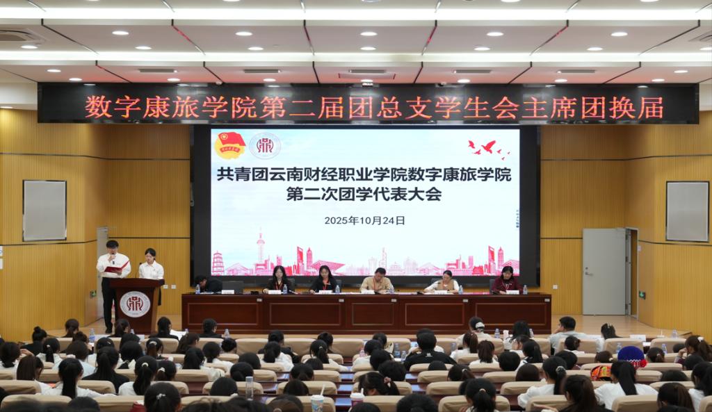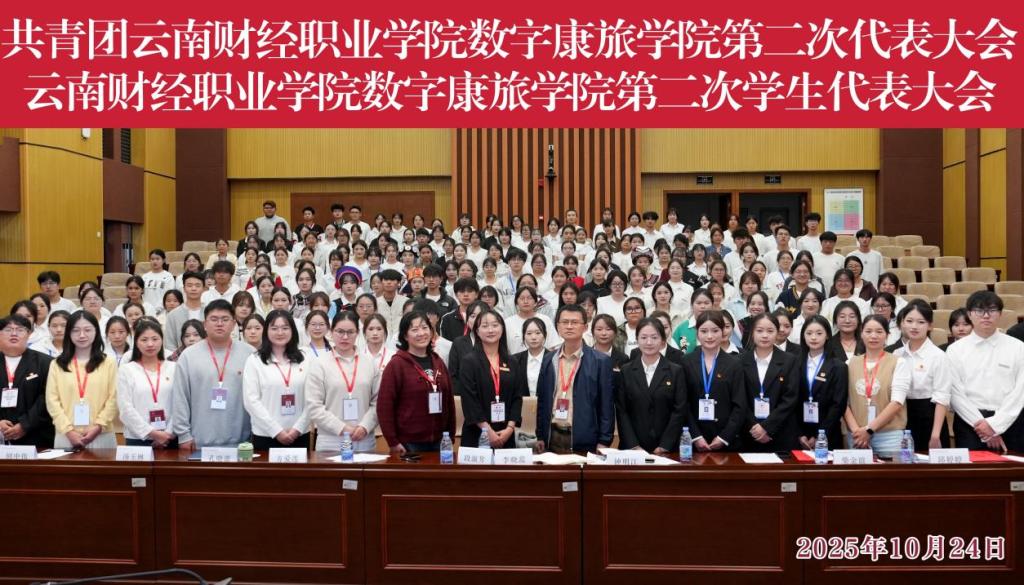 2025年10月24日,云南财经职业学院数字康旅学院第二次团学代表大会在图书馆报告厅如期举行。数字康旅学院党支部书记、副书记,团总支书记以及教师代表出席本次会议。