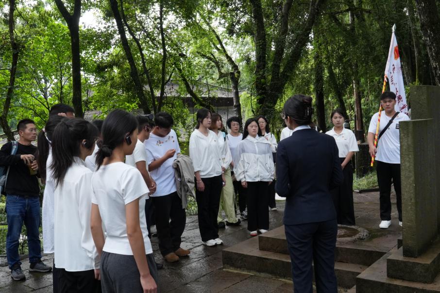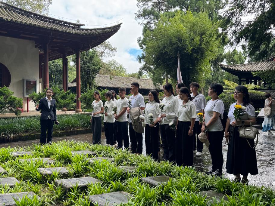 上午,实践团赴国殇墓园,守护国家与人民的烈士忠魂在此长眠。中国远征军烈士名录墙上,10万多名参与滇西抗战的中国远征军将士及地方参战人员的姓名静静镌刻。实践团成员庄严肃立,向收复滇西失地的烈士默哀鞠躬,献上菊花,致以崇高敬意。