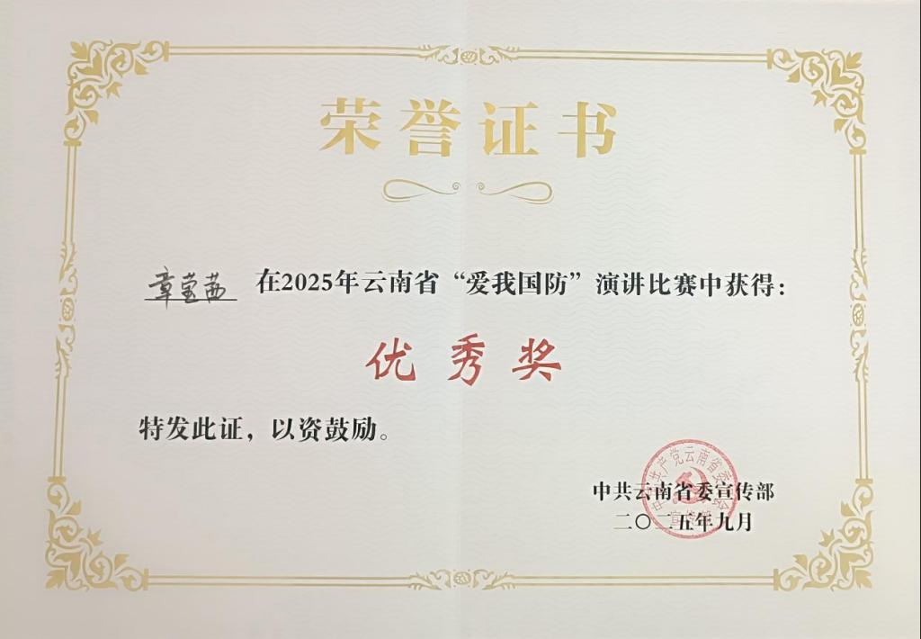 近日,由中共云南省委宣传部主办,中共云南省委省直机关工委、中共云南省委教育工委、云南省国资委协办的2025年云南省“爱我国防”演讲比赛决赛圆满落幕。云南财经职业学院章莹茜同学凭借出色的表现,荣获大学生组“优秀奖”!