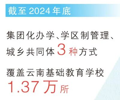 近年来,云南省基础教育优质资源辐射引领力持续增强,截至2024年底,集团化办学、学区制管理、城乡共同体3种方式覆盖云南省基础教育学校1.37万所、学生572.79万人,学校、学生覆盖率分别达54.51%、68.63%。