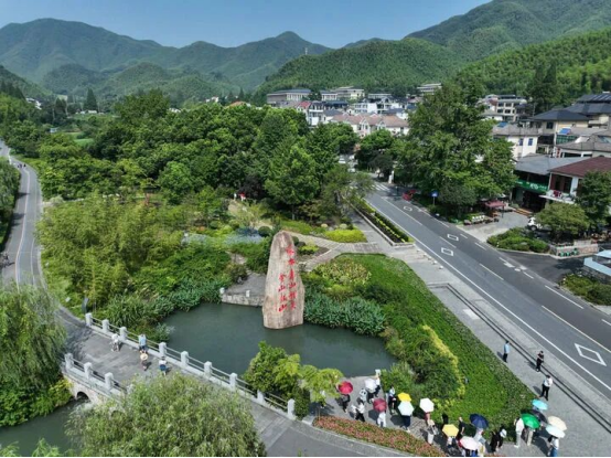 2023年8月11日,游客在浙江安吉余村参观(无人机照片)。新华社记者 翁忻旸 摄