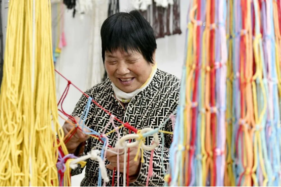 2024年12月13日,在山东省惠民县姜楼镇一处巾帼共富工坊,工作人员在编织绳网。新华社记者 郭绪雷 摄